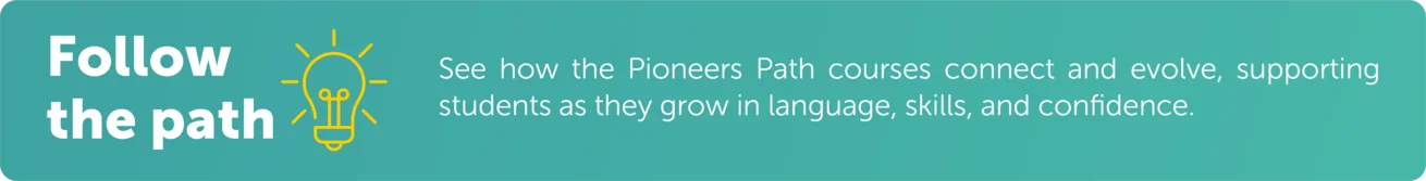 The Pioneers Path builds strong foundations in grammar, vocabulary, and reading across all three series. Concepts are recycled and grow in complexity, while consistent activity types help learners focus on language, not instructions. As curiosity turns into critical thinking, students learn to explore Big Questions and analyse global issues with confidence.